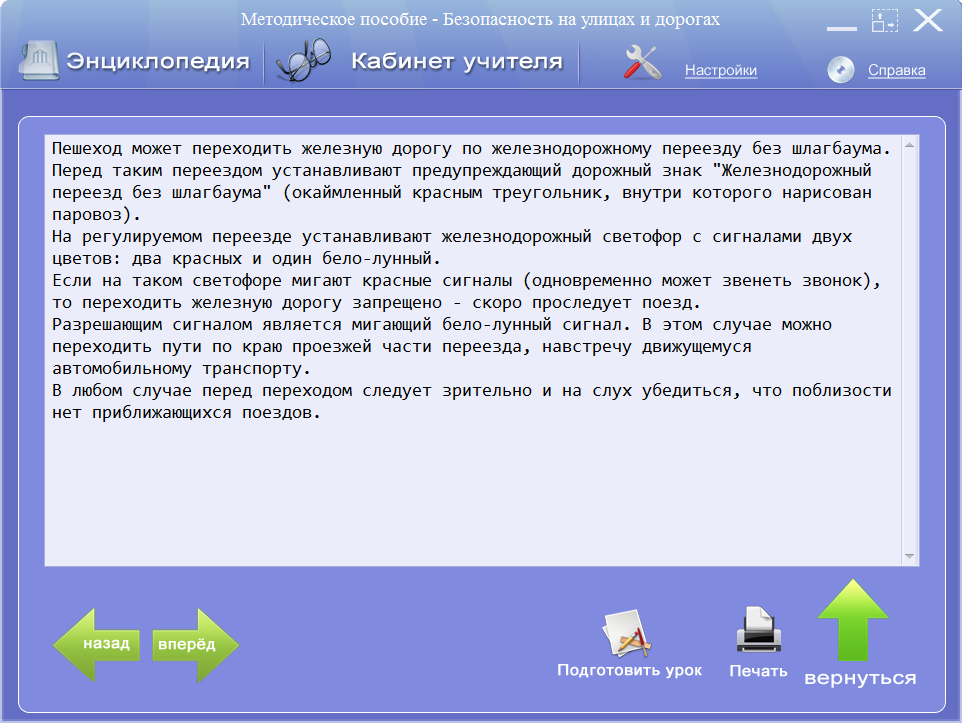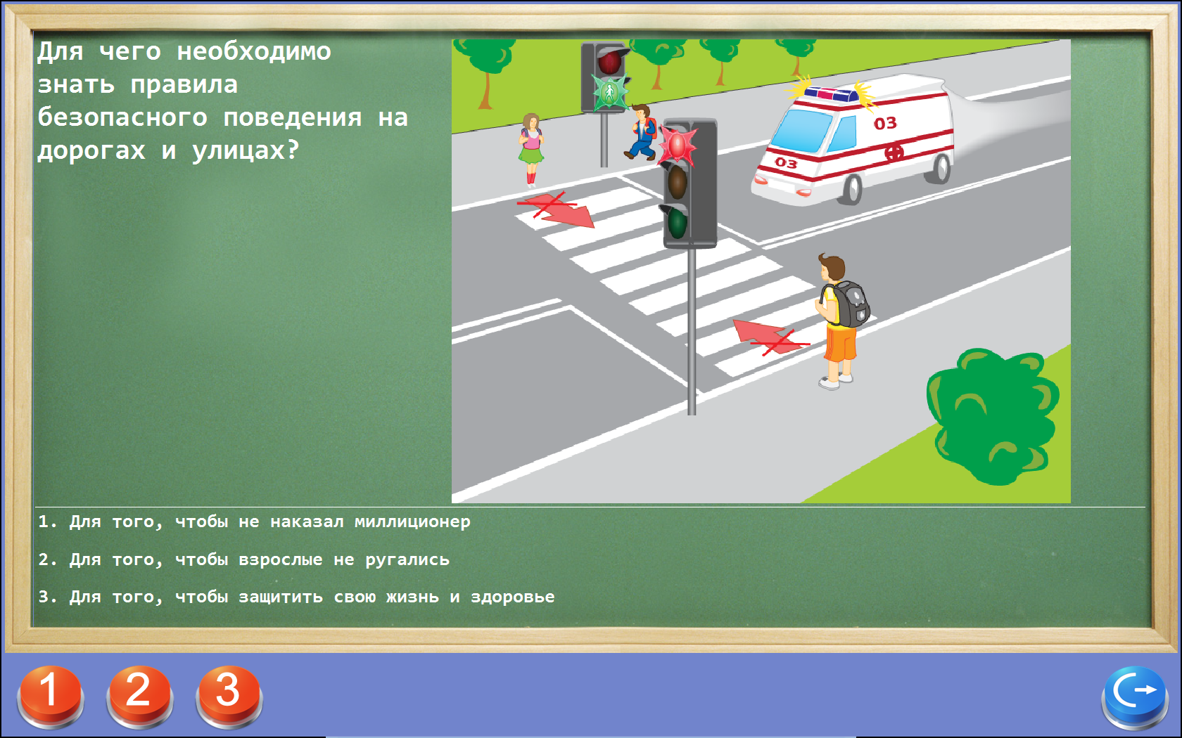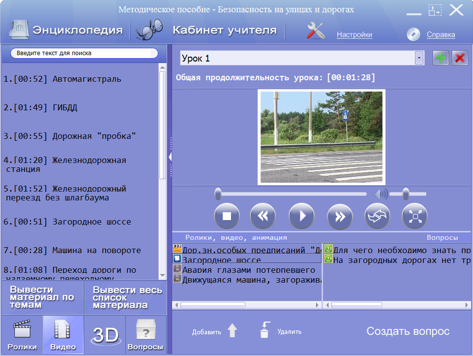 Содержит информацию о безопасности на дорогах, дорожных знаках, сигналах управления движением, дорожной разметке, безопасном поведении на дороге, в транспорте, даёт возможность продемонстрировать способы преодоления наиболее опасных "дорожных ловушек", объяснить и показать последствия неправильных действий.