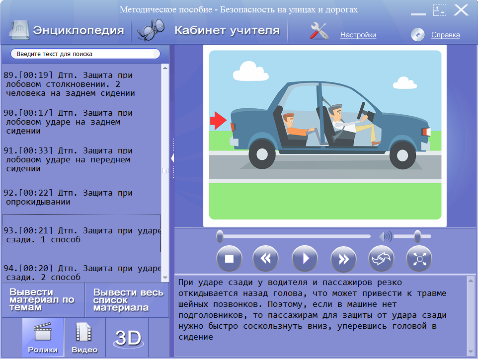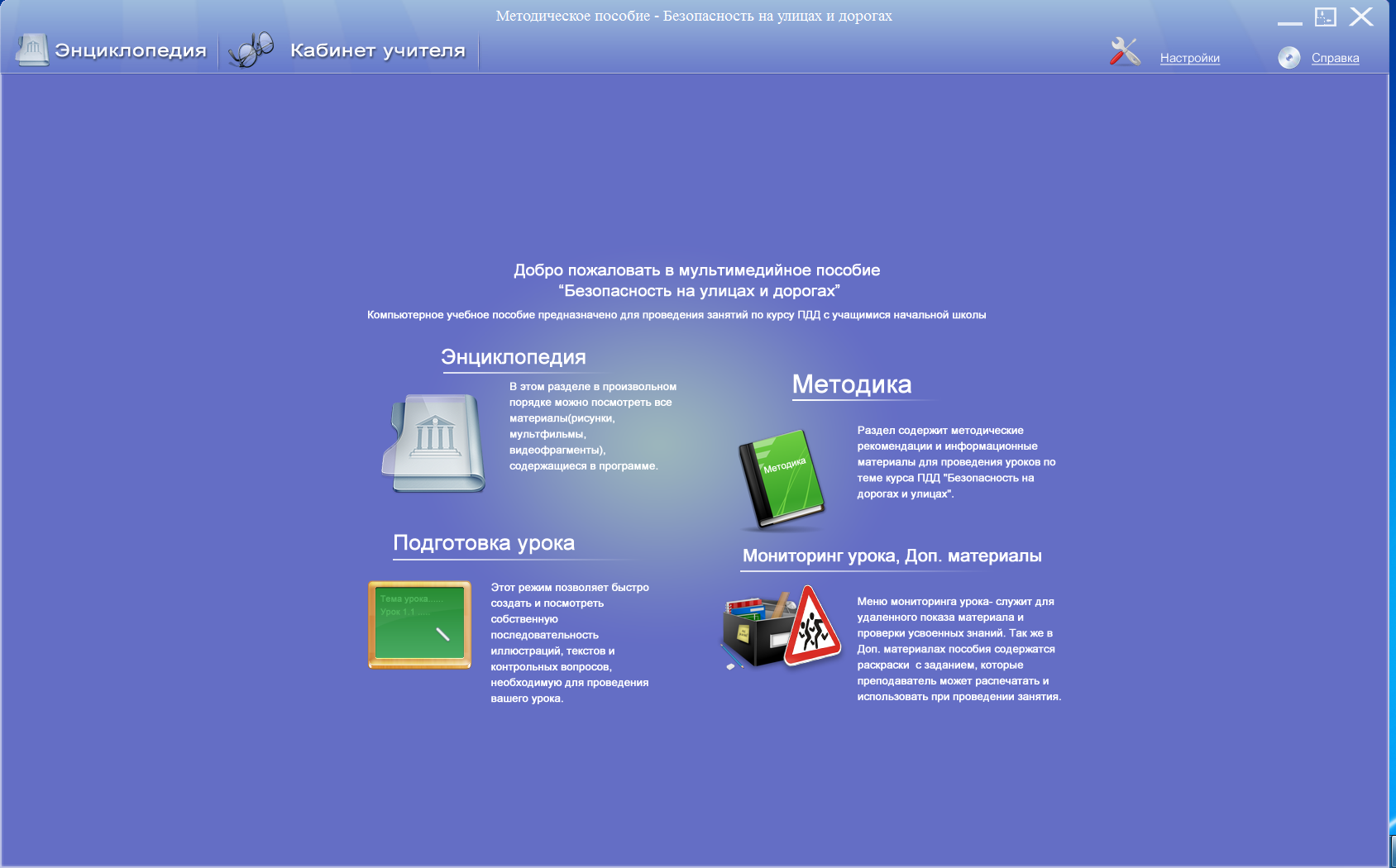 Содержит информацию о безопасности на дорогах, дорожных знаках, сигналах управления движением, дорожной разметке, безопасном поведении на дороге, в транспорте, даёт возможность продемонстрировать способы преодоления наиболее опасных "дорожных ловушек", объяснить и показать последствия неправильных действий.