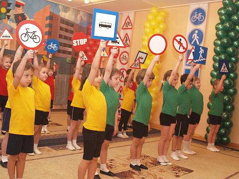 Звучит песня «Мы едем, едем, едем…», в группе развешены плакаты дорожных знаков, макет светофора. Дети стоят кружком.